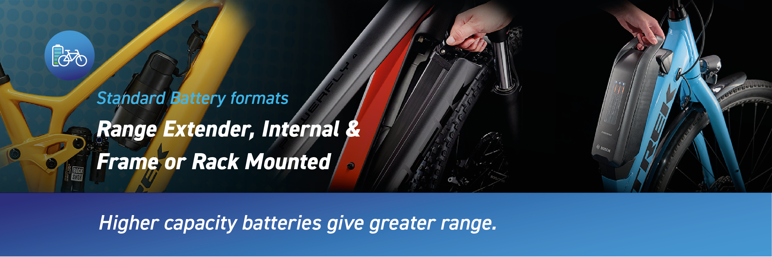 Electric bike batteries are either removable (Bosch crank mounted system), or integrated into the frame (Hyena hub system). If it’s removable, it is often possible to upgrade to a larger capacity battery, whereas an integrated battery will need to be supplemented with a bolt-on ‘range extender’ battery. Bosch also offers a range extender battery which is compatible with certain electric bike models.
