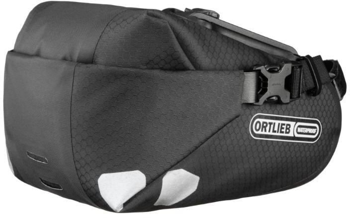 The waterproof Ortlieb Saddle-Bag is available in two sizes and three colours. It is particularly suited for mountain and road biking, but is also an ideal supplementary bag for long tours with lots of luggage. Even the small version offers enough space for a spare tube, repair kit or rain jacket, whereas the larger model with 4.1L almost replaces a backpack. It functions at the same time as kind of protection against mud and water spray.Both models feature highly luminescent reflectors and daisy chains for fixing a rear light. The roll closure is secured to the sides with buckles.The mounting set is available as accessory for a second bike.Fabric: PS21/PS21RHeight: 12cmWidth: 16cmDepth: 19cmVolume: 1.6LWeight: 220g