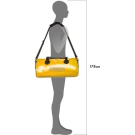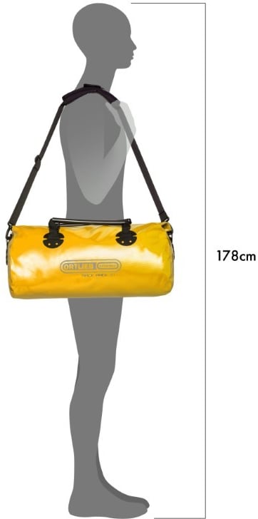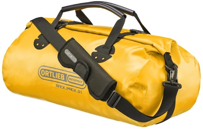 This 100% waterproof travel bag has all the advantages of an easy to use dry bag: its flexible and variable packing volume adjusts to any situation and takes all the gear for travelling and sports. The roll closure with stiffener bar has its roots in stuff sack technology. It fits perfectly into bike trailers and size 24L or 31L can be combined with Ortlieb Back/Sport-Rollers on the rack for bike touring. This robust bag is also good on motorcycles. Comfortably carried with adjustable padded shoulder strap and carrying handles. The Rack-Pack is available in four sizes.Fabric: PD620Height: 30cmWidth: 54cmDepth: 27cmVolume: 31LWeight: 760g