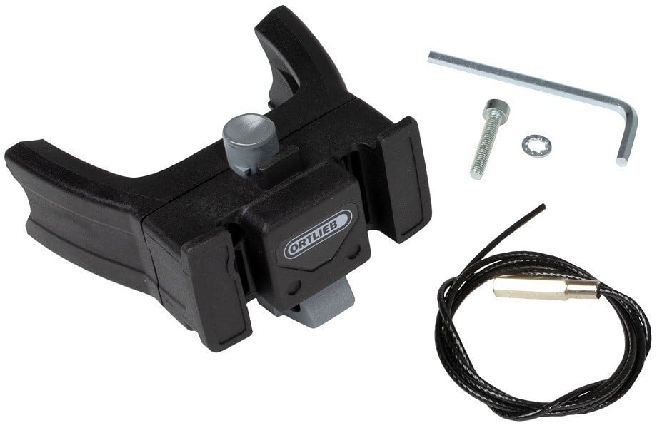 Mounting set with cable fixing for ORTLIEB handlebar bags and baskets with wide block; ideal for use with e-bike displays; universal cord attachment; reflective tape on front; Holder compatible with bags and baskets of other brands.